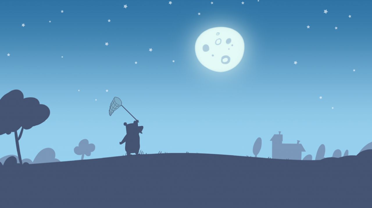 Медведь притворяется, что ловит бабочку сачком, а проказница уворачивается, но далеко не улетает. Так они играют целыми днями...