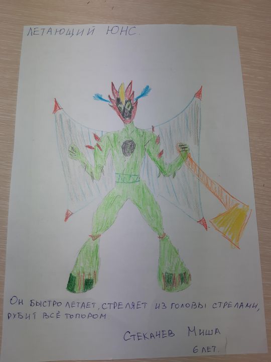 Летающий Юнс,он очень быстро и ловко летает,стреляет из головы стрелами и рубит всё топором.