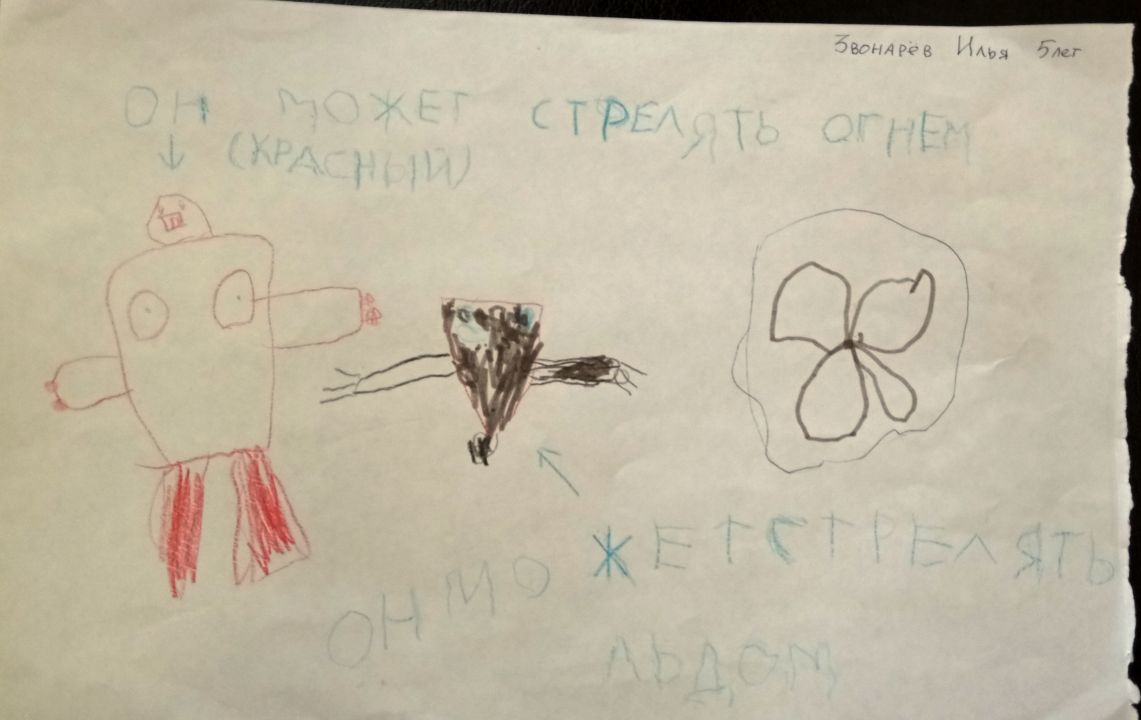 Красное чудовище-монстр, стреляющий огнём. И робот- снежный человек, который стреляет льдом.