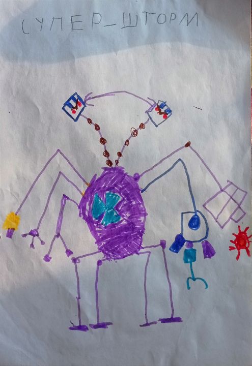 Робота зовут супер шторм, он метает бомбы и умеет руками поднимать тяжёлые вещи, например, дома. А слева нарисована рука, которая может поднять целый дом. И ещё у него 4 ноги. И 2 головы, они летают.