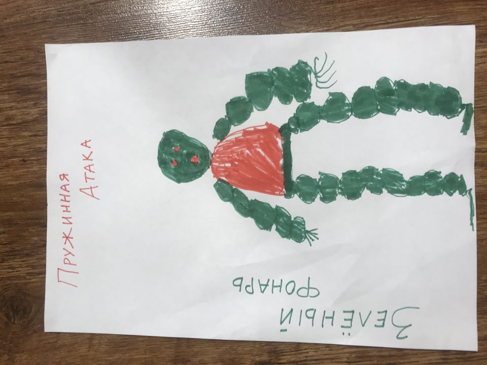 Это Зеленый фонарь. Его суперспособность - это пружинная атака, его ноги и руки - это огромные пружины, которые отталкивают противника и не дают возможности приблизиться.
