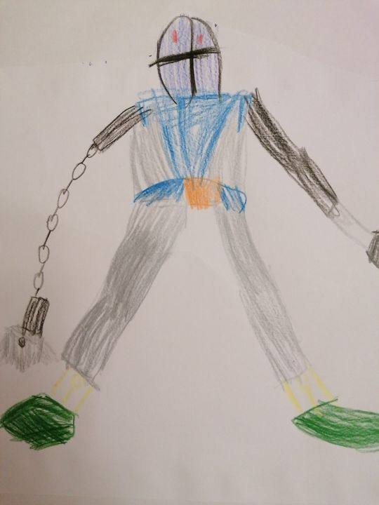 Этого злодея зовут Робопил. Он может метать пилу и притягивать её обратно. Ловко прыгает и скрывается за маской