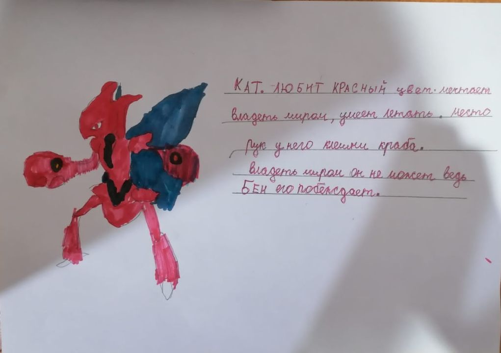 Кат-любит красный цвет,мечтает владеть миром,умеет летать. Вместо рук у него клещни краба.