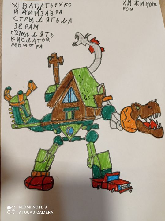 Моего злодея зовут хижинотрон. Он может уничтожить врага лазерам, может покусать головой динозавра которая находится на руке вместо пальцев, его хвост пуляется кислотой. А его голова ввиде домика .