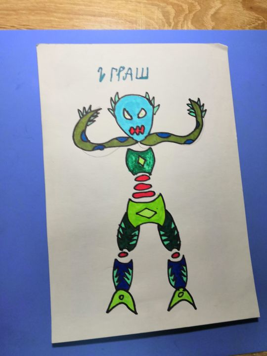 Мой злодей Z Граш. Он имеет супер способность вытягивать щупальцы. Ещё у него есть огненный лазер, который разрушает каменные преграды. А его части тела могут разбираться на много частей.