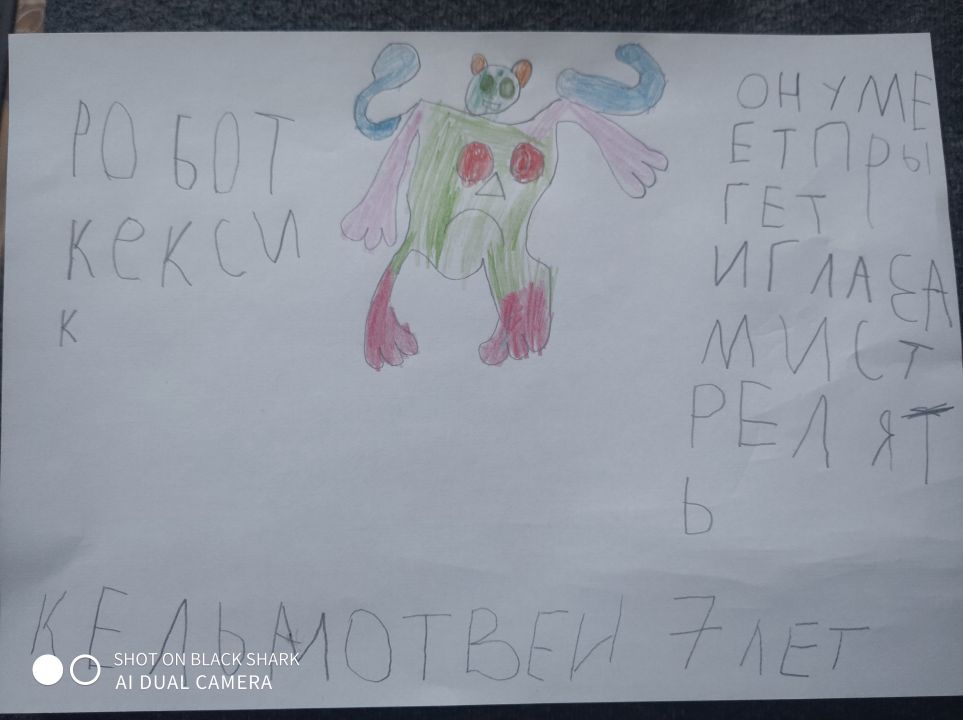 Робот "Кексик" . У него есть суперспособности стрельба лазером из глаз. И очень высокие прыжки.