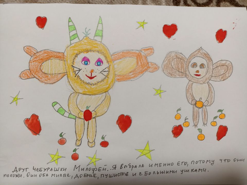 Я нарисовала Чебурашку с другом Милофеем. Я выбрала ему именно этого друга ,потому что они похожи. Они оба милые, добрые, пушистые и с большими ушами