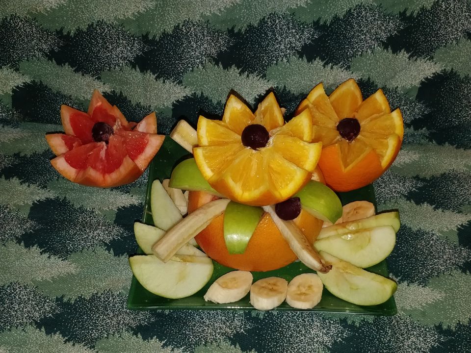 Фруктовый фонтан-цветок! Грейпфрут,апельсин,яблоко,банан,вишня. Все красиво нарезать и подавать на стол.
