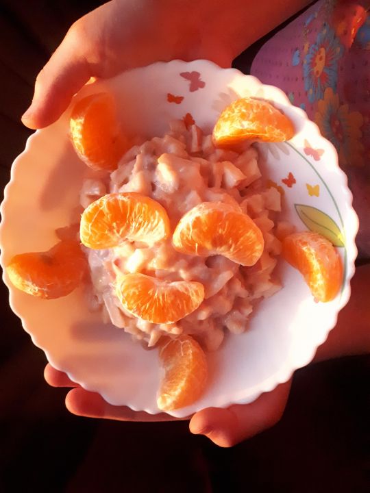 Фруктовый салат "Солнышко" Ингридиенты: мандарин, апельсин, банан, яблоко, фрутовый йогурт. Фрукты нарезать на мелкие кубики, добавить йогурт, перемешать и украсить дольками мандарина. Приятного аппетита!