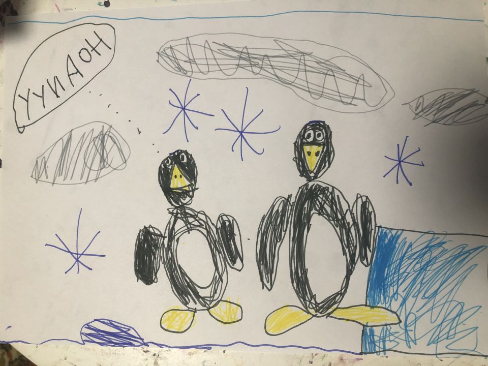Это пингвинчики. Один поднимает клювик, потому что он учится петь. Они очень любят плавать. Осипова Ксюша, 5 лет