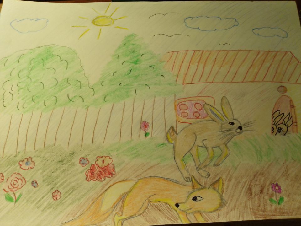 Лис и Зайц. На рисунке изобразил как лис пытается обмануть зайца,чтобы попасть к нему в дом. Томилов Алексей Александрович. 9лет.г.Екатеринбург.