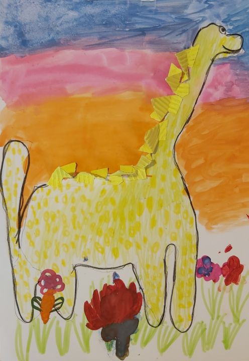Динозавр по имени Хорошик. Гуляет на закате и ищет своего друга. Рисовала Маша Савченко с города Иркутска