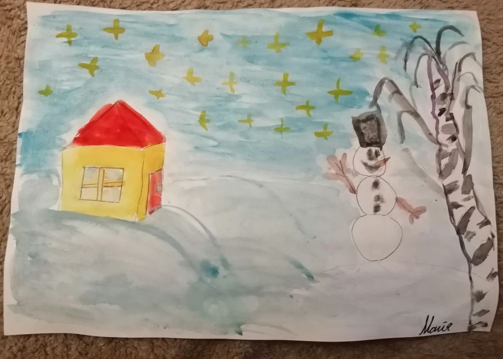 Меня зовут Майя, мне 9 лет. Случайно нашла ваш сайт и решила зарегистрироваться. Моя работа называется "Зимний вечер в деревне".