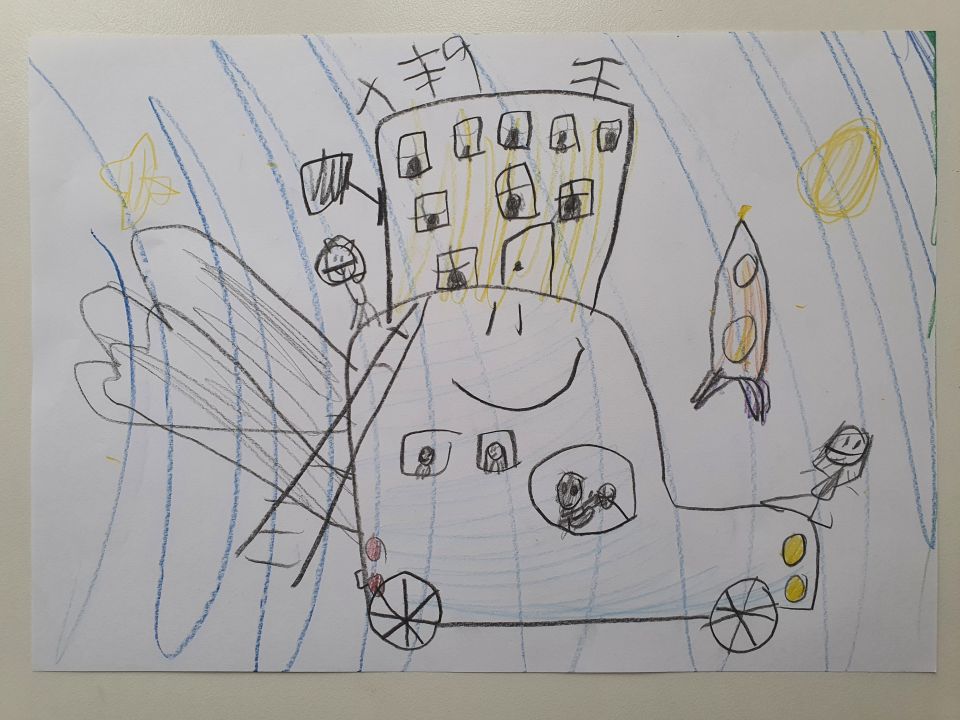 На рисунке изображена машина, которая везёт с собой дом, кота, людей, телевизор, ракету и луну со звёздами и лесенку, и крылья на ней. И она полетела так в космос. Алиса, 7 лет.
