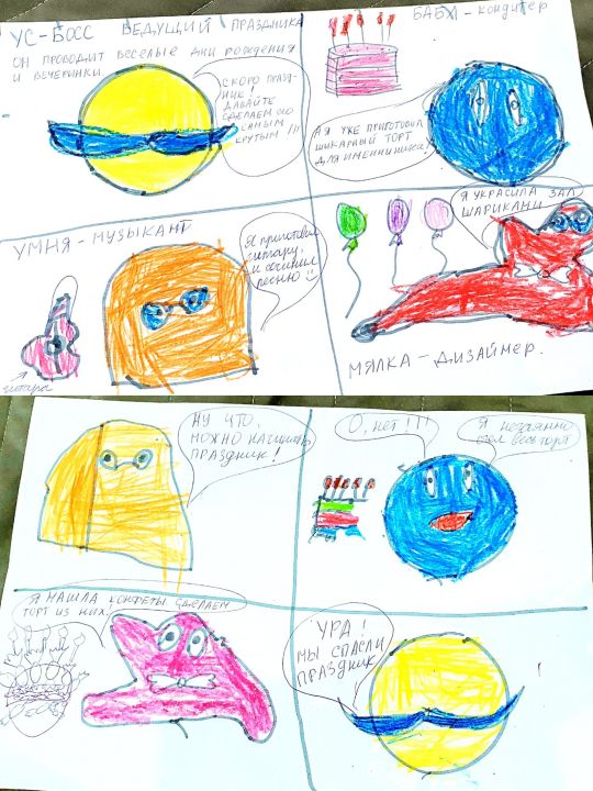 Мялка - главный спаситель праздника, именно она сделала торт из конфет, взамен сьеденного торта Баблом. Друзья очень любят устраивать весёлые праздники всем детям)
