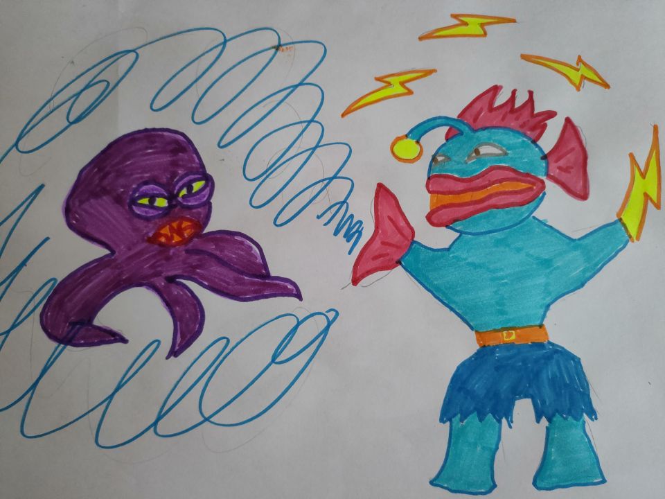 Гуджитсу Вол-Мол. Особые способности, одной рукой-плавником - создавать поглощающую волну, второй рукой-молнией - пускать электрический разряд.