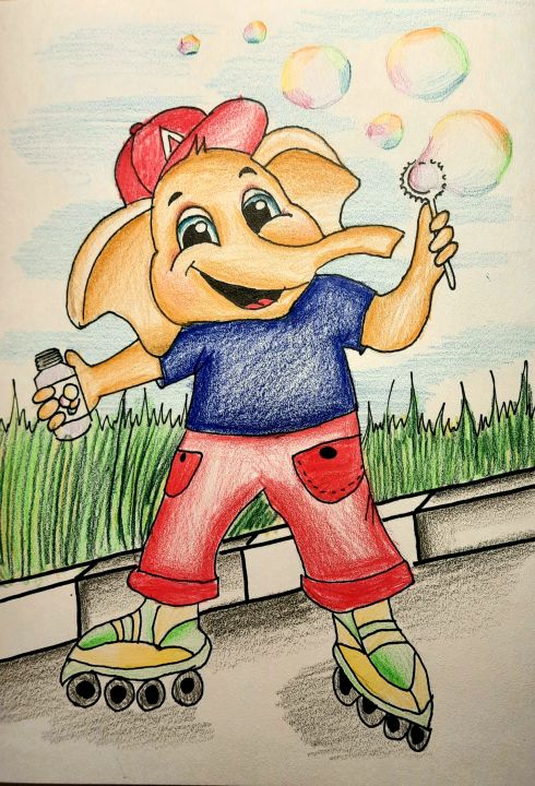 Добрый слоник Ломтишка,любит активные и спортивные игры.Время перемен!Я изобразила его не на скейте,а на роликах,а в руках у него красочные и волшебные мыльные пузыри!Всем участникам конкурса-удачи!
