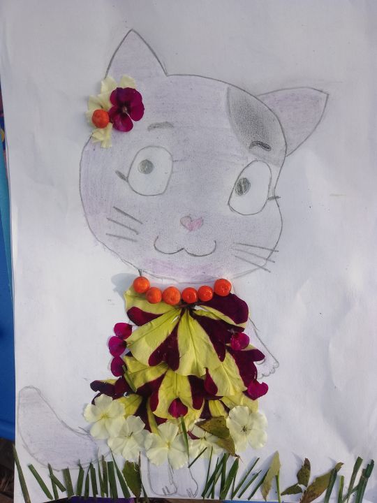 Это Муся! У нее праздничный наряд из цветов и рябиновые бусы.