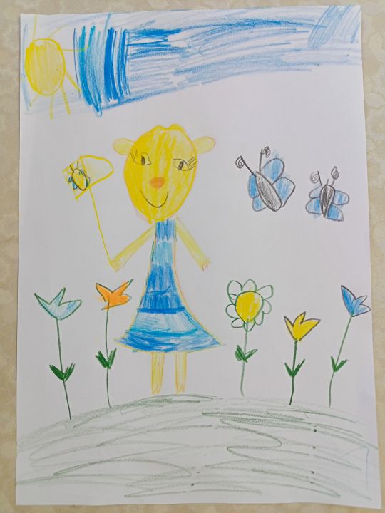 Я изобразила Зо, которая гуляет по цветочной полянке и ловит сачком бабочек. Она мне очень нравится, потому она красивая, милая и добрая.