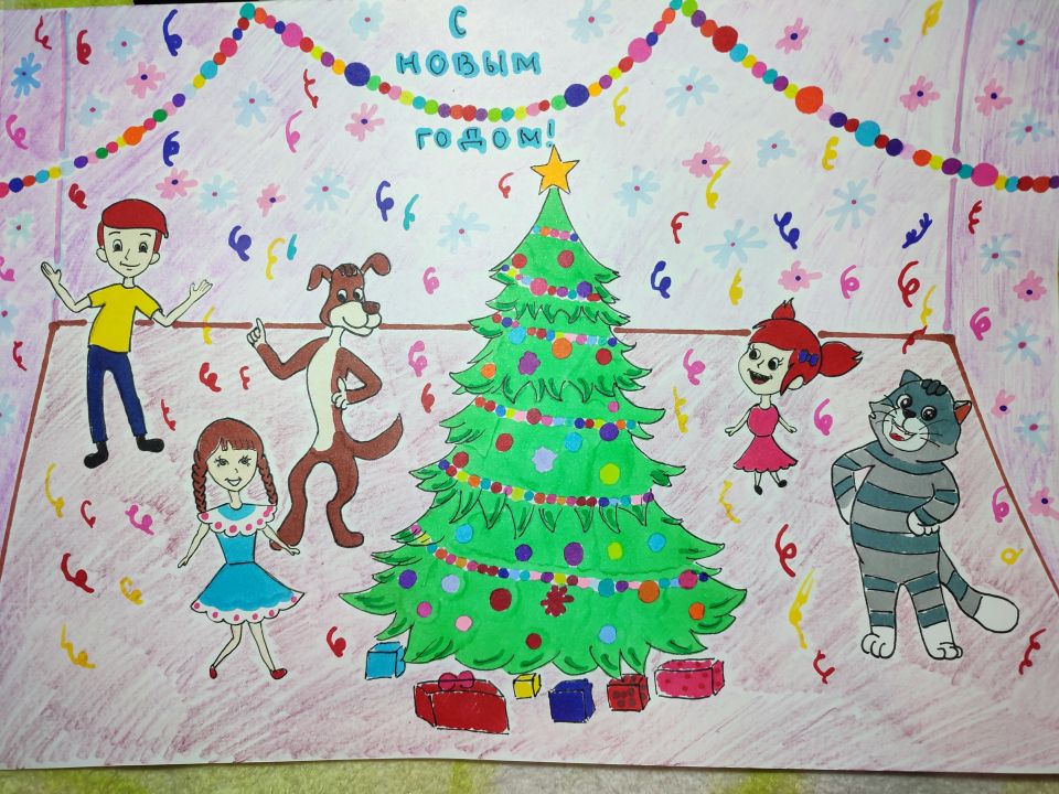 Мой любимый герой это Вера Павловна. Она очень милая и красивая, придумывает разные интересные вещи. На рисунке я изобразила, как мы все весело танцуем вокруг ёлки. Желаю всём радости и веселья.
