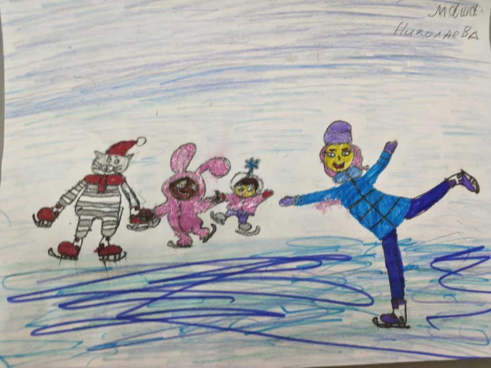 Оля катается на коньках очень красиво, а с ней хотят кататься Таматама и Вера Павловна! А Матроскин вместе с ними хочет тоже кататься на коньках!
