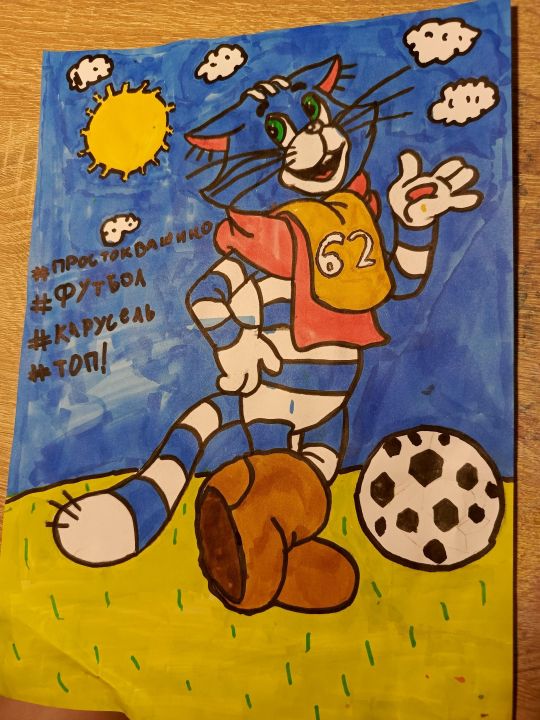 Это Матроскин. Он любит играть в футбол. Его мечта-стать великим футболистом. И его верные друзья помогут в этом.