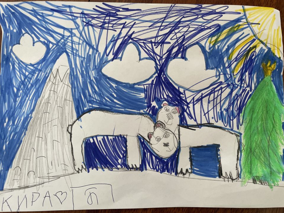 Свою работу я рисовала фломастерами и карандашами! На ней я нарисовала маму медведицу и её сына Умку. Они находятся в Антарктике. Так же я нарисовала гору, а на самой вершине горы, и летом , и весной.