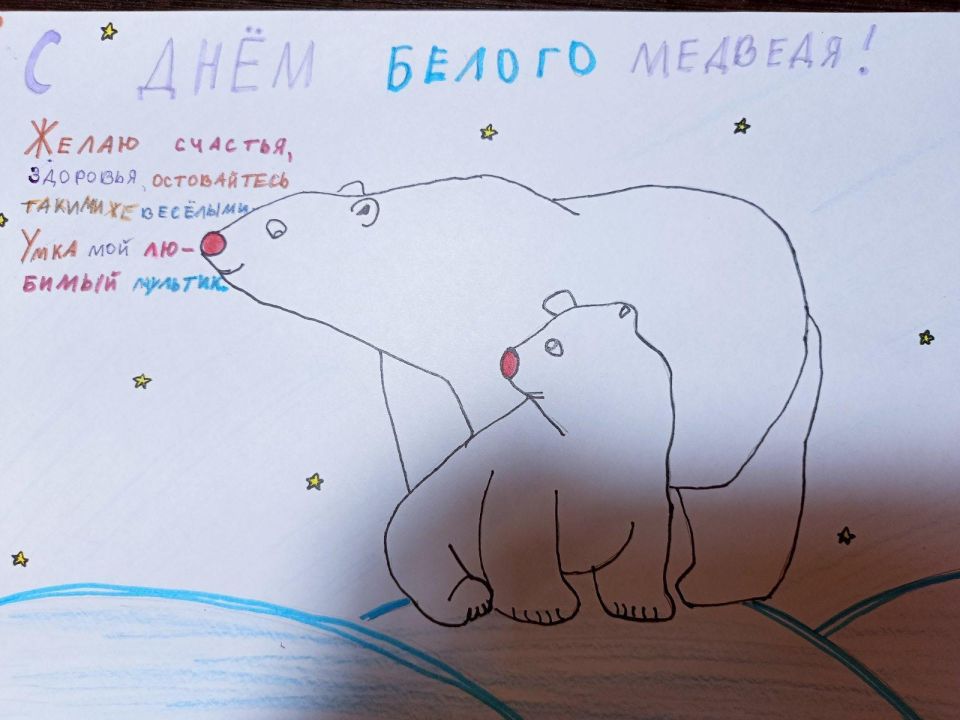 Эту работу я сделала с огромной душой . Умка мой любимый мультик . Этот мультфильм я смотрю с 6 лет уже целый год . Я люблю Умку .