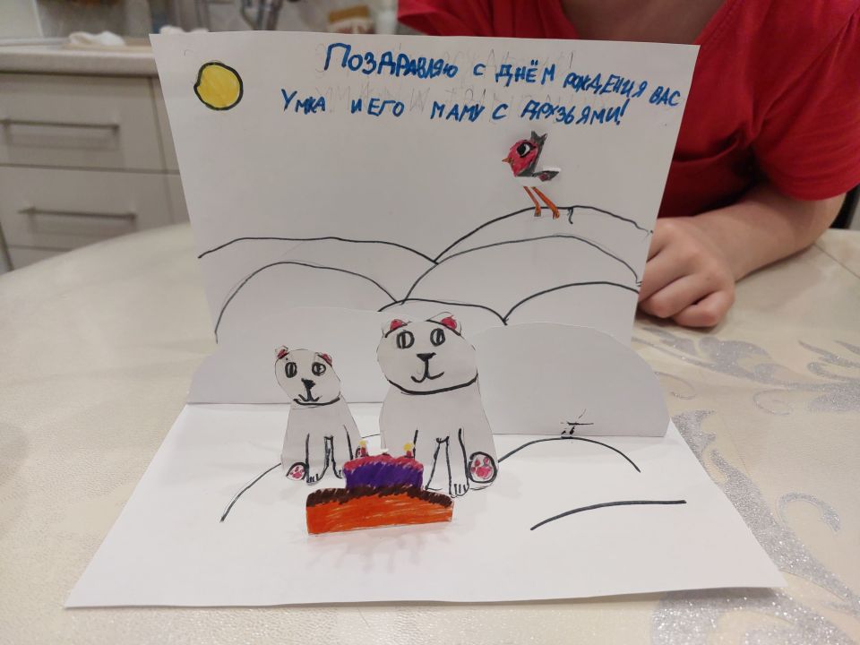 Я сделала из бумаги Умку и его маму,а ещё птичку-друг Умки.Сугробы и торт тоже из бумаги вырезала и приклеила.