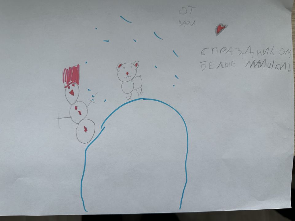 Милый белый мишка в компании снеговика ждет детских поздравлений. Я нарисовала такой рисунок, чтобы больше детей узнали о таком празднике - день белых медведей.
