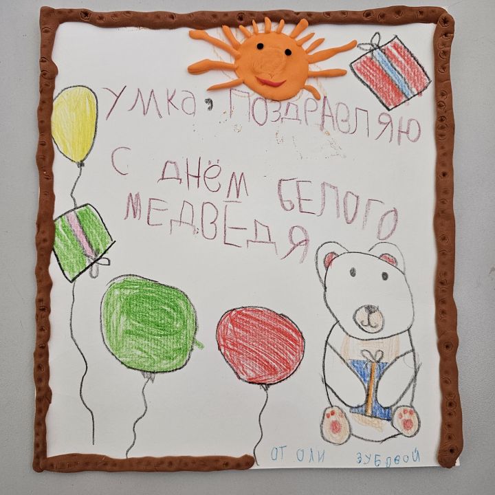 Оля с удовольствием смотрит телеканал карусель. Узнав, что проходит этот конкурс, с радостью принялась рисовать открытку и самостоятельно писать поздравление для Умки.