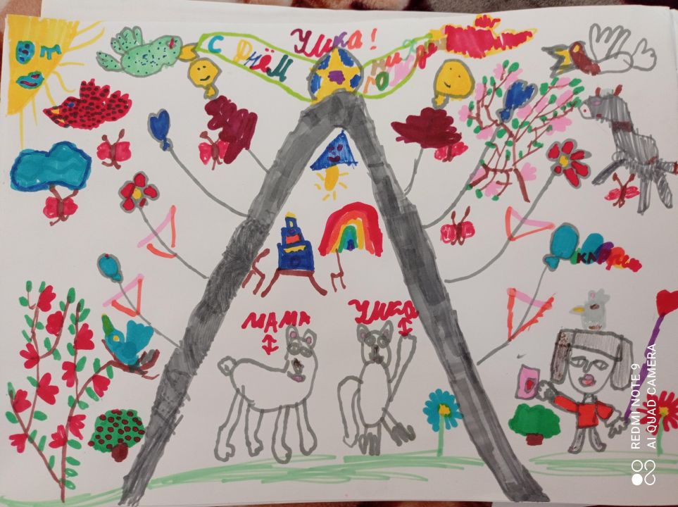 На моей открытке Умка и его мама. Тайка идёт к нему на праздник. Солнышко улыбается Умке.
