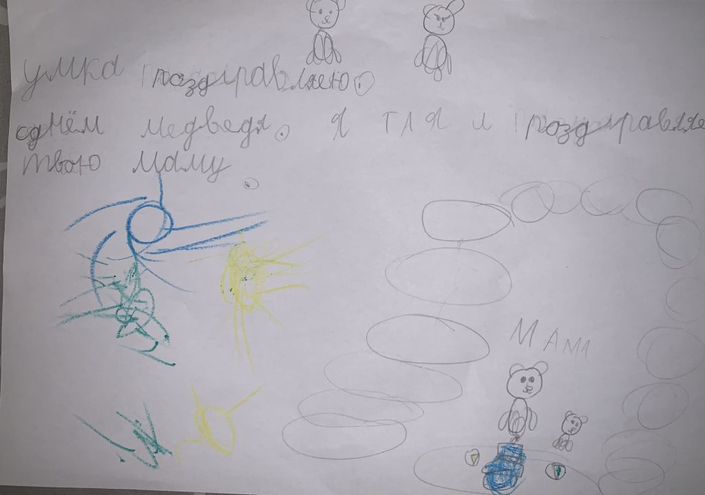 На рисунке я написала поздравления Умке и его маме. И нарисовала их