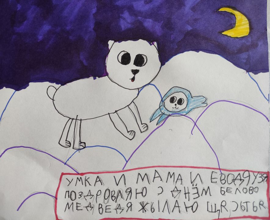 На рисунке Умка и Горо. Кира поздравляет Умку и его маму с праздником.