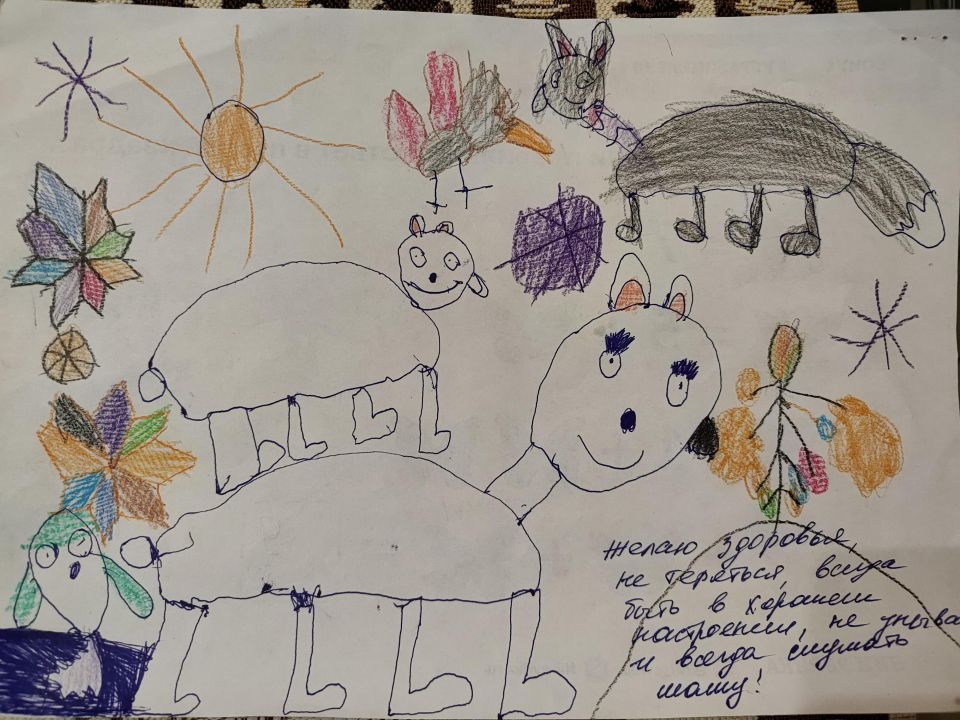 На рисунке изображены Умка с мамой, а также полярный волк, розовая чайка и Кора.