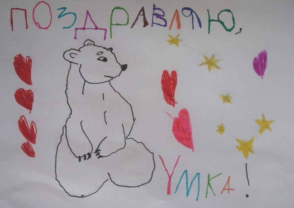 Поздравительная открытка Умке! Нарисована с любовью и с ожиданием, что открытка дойдёт до Медвежонка. Азиза очень любит этого персонажа. Она,увидев этот конкурс по Карусели,захотелаучаствовать в ней.
