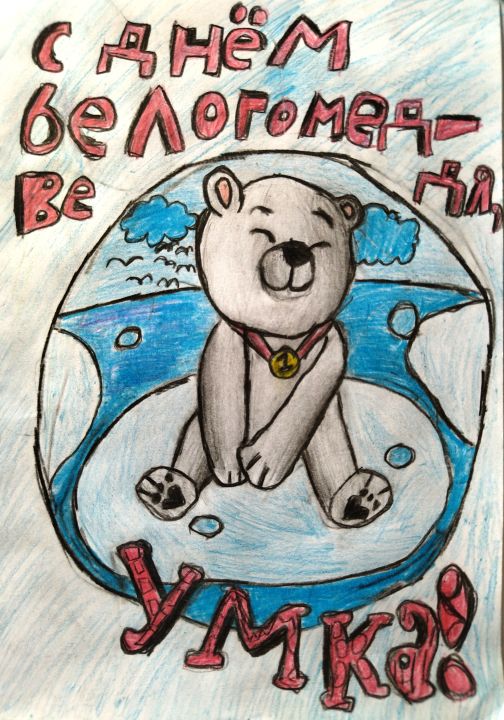 На моей работе изображен Умка, который выиграл первое место в конкурсе чтецов и плывет домой на не большой и не маленькой льдине.