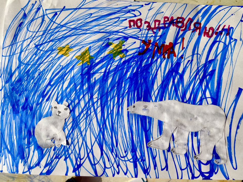 На этой открытке я нарисовал Умку и его маму, которые смотрят на звездное небо!