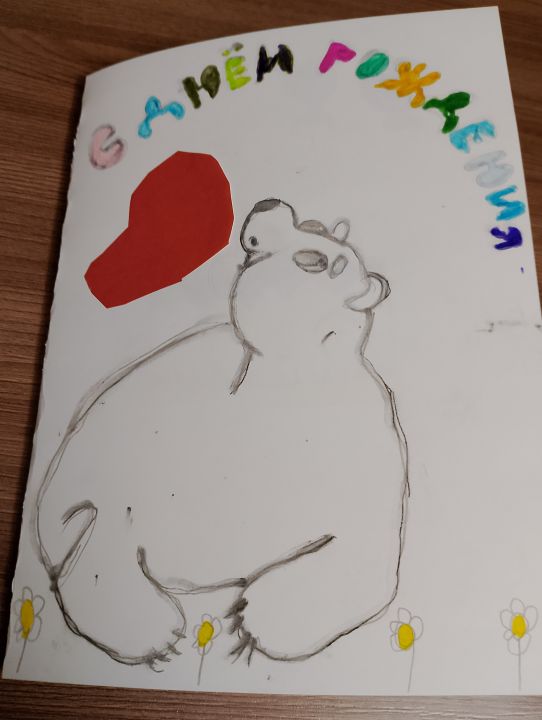 Я долго тренировался рисовать Умку и наконец-то у меня получилось! Внутри открытки я нарисовал торт и написал поздравление. "Умка, с днём рождения! Желаю много пятёрок, удачи во всем". Юрий