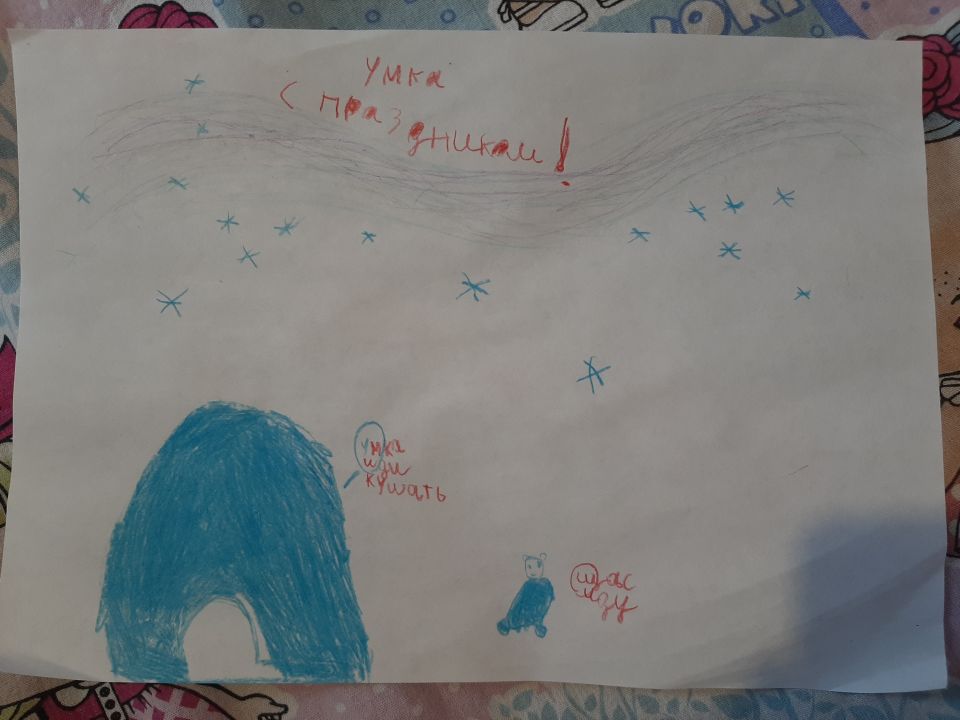 Я нарисовала на картинке как Умка гуляет, а мама завет его кушать.