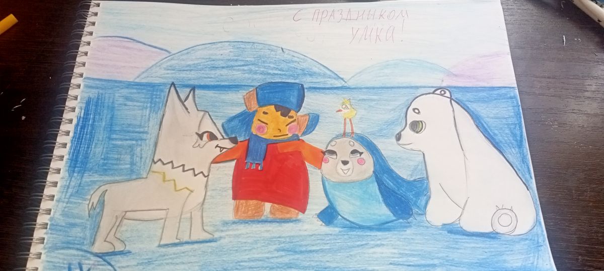 На рисунке изображен Умка и все герои мультфильма, это один из кадров серии, герои очень веселые, и поддерживают друг друга