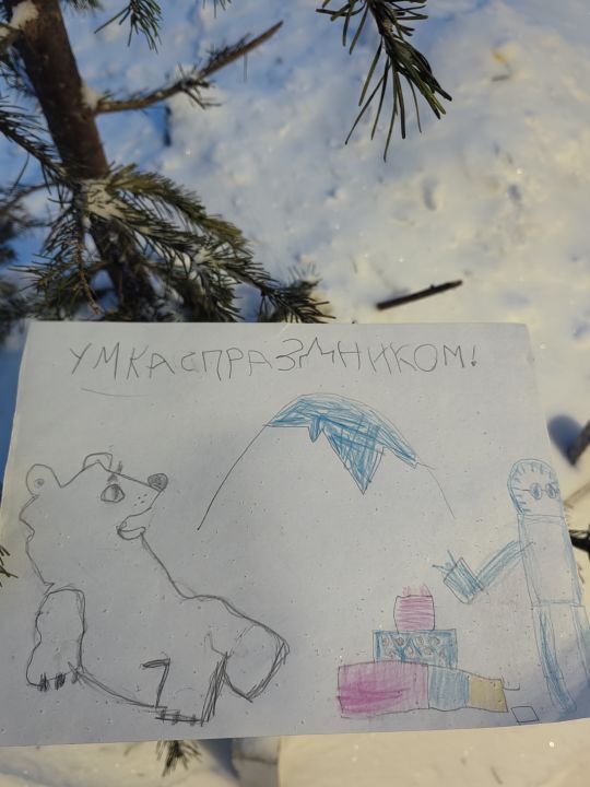 Милый Умка, мама и его друзья! Поздравляю с Праздником! Нарисовал себя и Умку. Я приехал к вам в гости, привез много подарков! Там много вкусного и интересного! Поделись обязательно с друзьями!