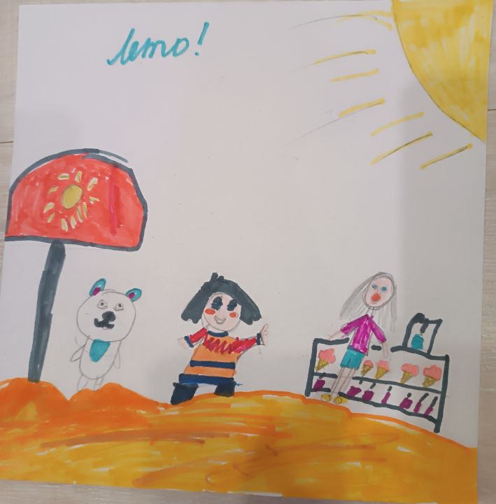 На этом рисунке нарисована веселая компания из Тайкэ и Умки, они радуются что наступило лето и первым делом они отправились на пляж- покупаться, позагорать и поесть мороженое.