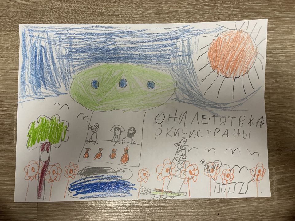 Умка и его друзья на воздушном шаре летят в жаркие страны к бегемоту, крокодилу, жирафу и верблюду.