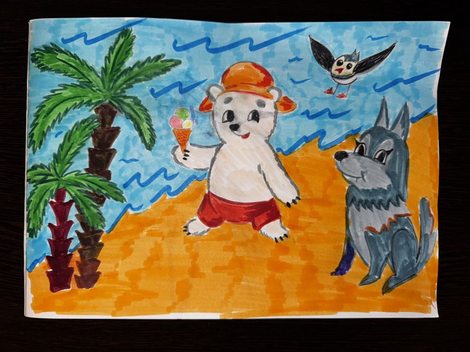 Умка приехал с друзьями на море. Чтобы ему не было жарко, так как северный медведь, он кушал мороженое, а на голову надел панамку.