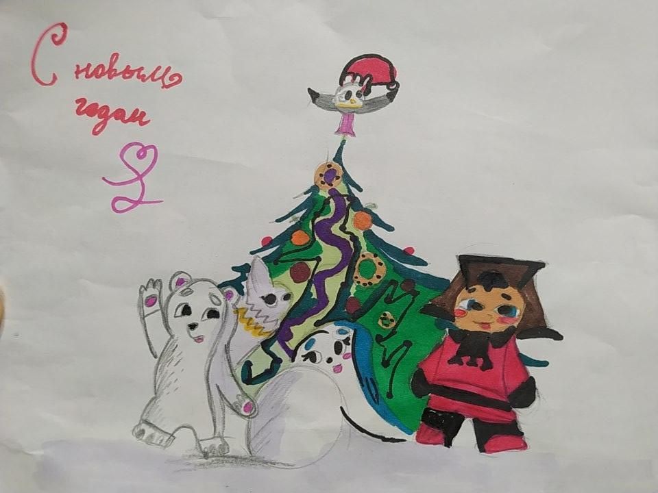 На этом рисунке Умка радуется ёлочке. Вместе с лучшими друзьями он поздавляет всех с наступающим Новым годом 🎄