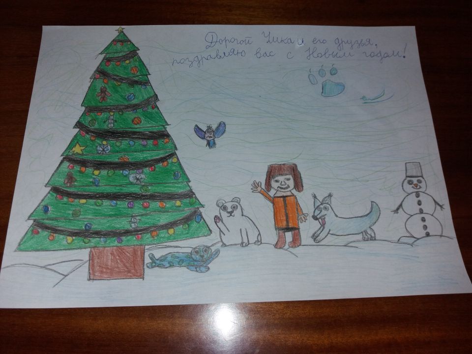 Я нарисовала Умку и его друзей, с ёлочкой. И поздравлением для них.