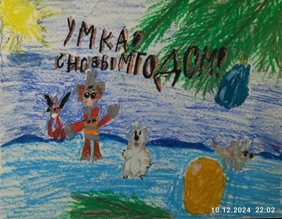 Умка находится в кругу друзей. Он принимает от них и от ребят поздравления с Новым годом.