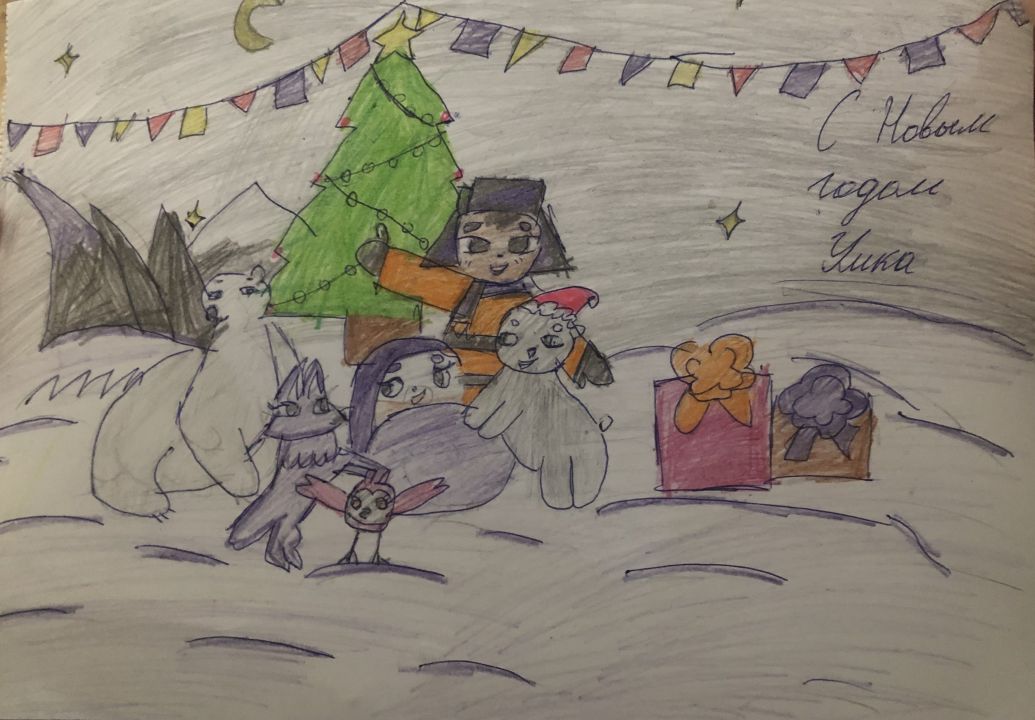 В своем рисунке хотела показать что счастье нового года это быть рядом со своими друзьями , и близкими.Я очень хотела чтоб Умка был с друзьями и у них была красивая ёлка !С наступающим Новым годом !