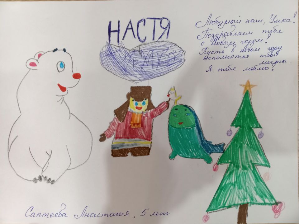 Меня зовут Настя. Это мой рисунок. Я старалась сама рисовать, но мама мне немного помогала. Я очень люблю смотреть мультик Умка.